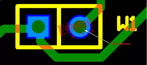 这个不良最大的可能是,客户建立封装时,把这个器件引脚形状按照圆形去建立补偿,因为这个器件的宽度为0.64mm,所以PCB板上的成品孔径为0.8mm.