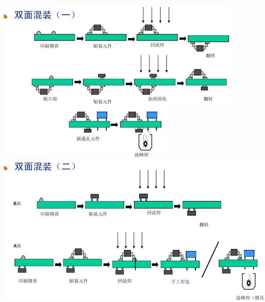 双面混装有以下两种方式,第一种方式PCBA组装三次加热,效率较低,且使用红胶工艺波峰焊焊接合格率较低不建议采用。第二种方式适用于双面SMD元件较多,THT元件很少的 情况,建议采用手工焊。若THT元件较多的情况,建议采用波峰焊。