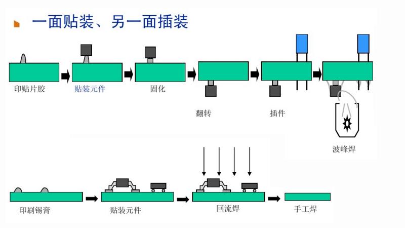 有些PCB板是双面板,一面贴装,另一面进行插装。贴装和插装的工艺流程跟单面加工是一样的,但PCB板过回流焊和波峰焊需要使用治具。