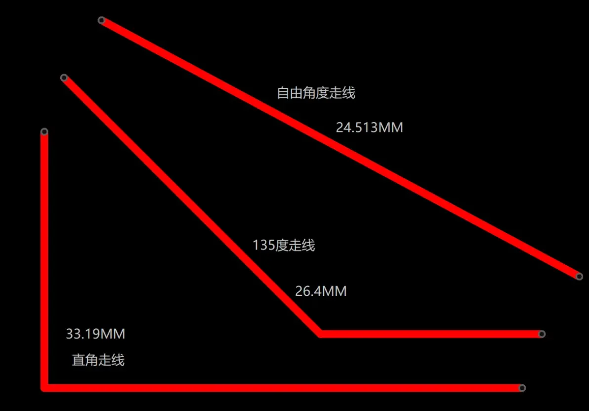 答案已经很直观了,直角走线不是不能走,而是走了压根没有任何好处,走线还变长了。自由走线固然最短,但是你板子上除了走线还要放元件,自由走线会增加布线难度。135和90度走线都方便调整,元件也可以45度摆放,所以PCB 135度走线,本质原因就是综合布线难度和长度的折中点。