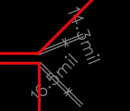 我们分别用13.7MIL的单线135度和90度拐角,找到拐角最宽点,如下图所示