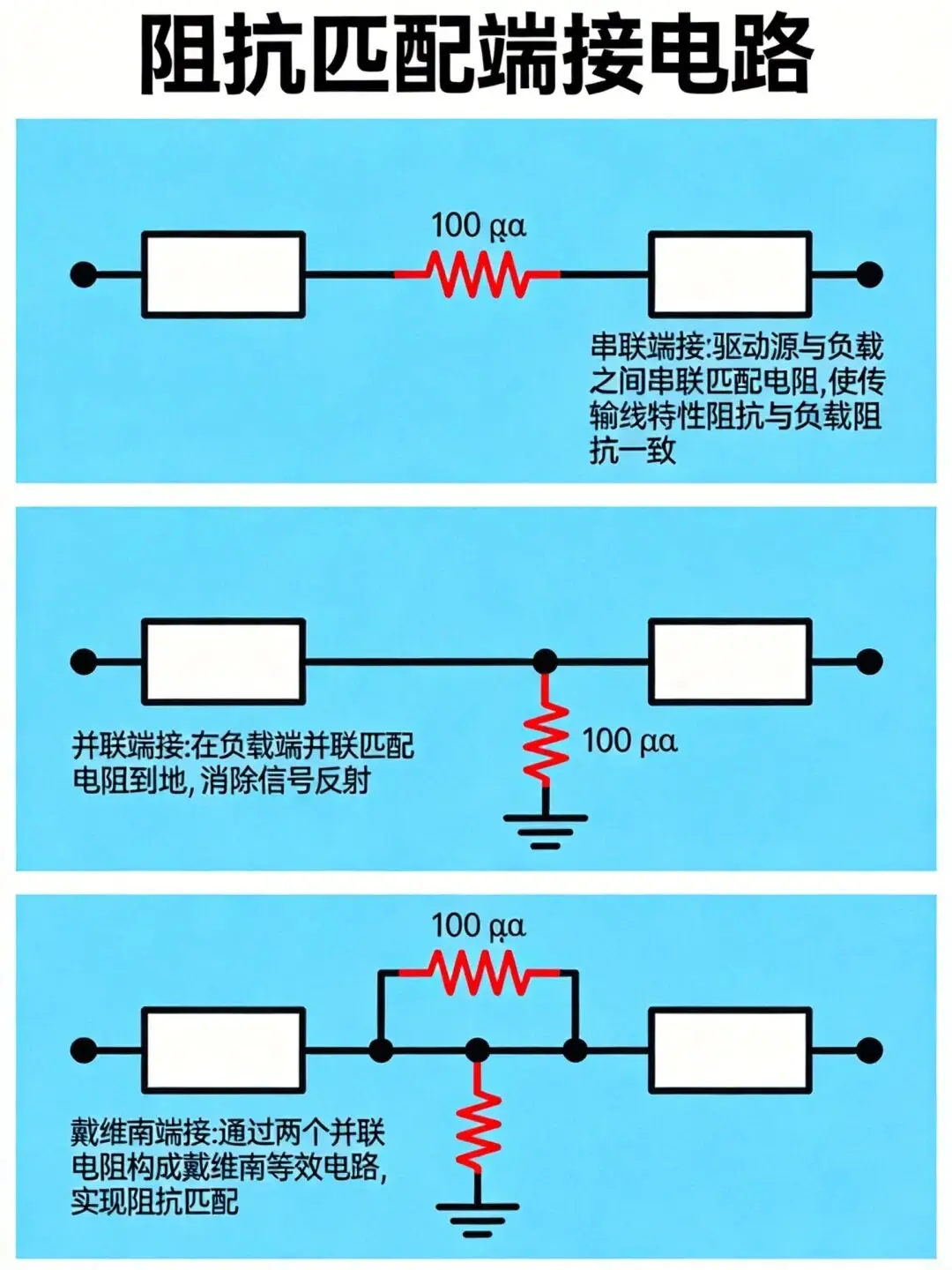 图注:上图展示了三种常用的端接电路。左图是并联端接,在负载端将电阻接至地或电源,使负载阻抗与传输线匹配;中图是戴维南端接,使用两个电阻分压提供匹配阻抗和直流偏置;右图是串联端接,在源端串联小电阻使总阻抗匹配传输线。选择端接方式时需要综合考虑功耗、驱动能力和布线空间。