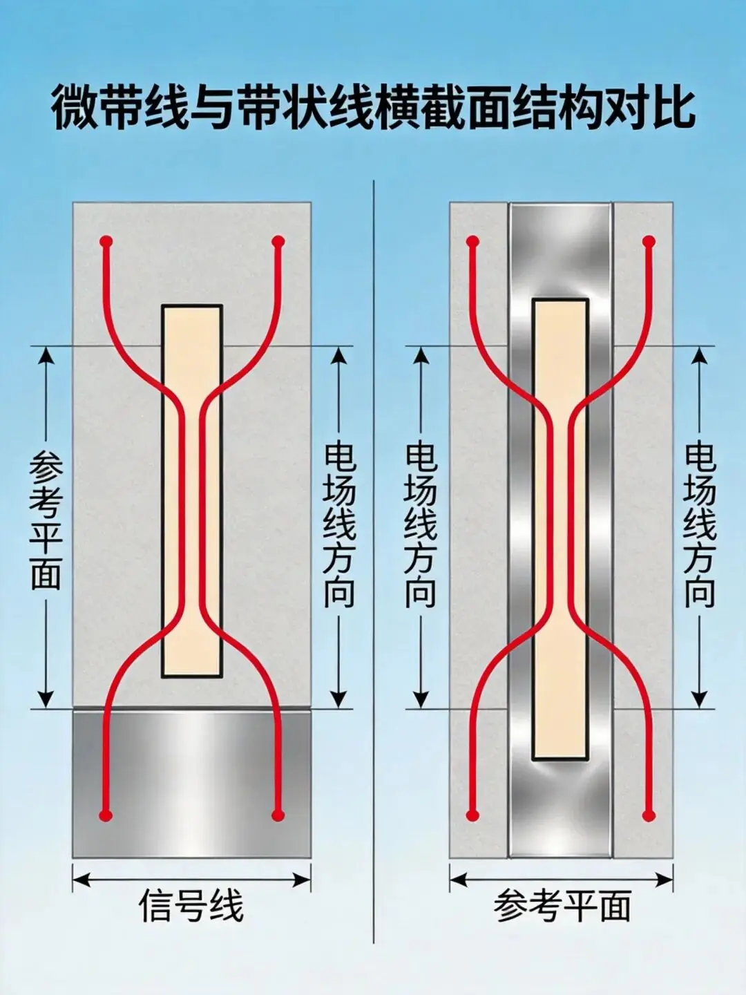 图注:上图展示了微带线(左)和带状线(右)的横截面结构。可以看到,微带线的信号线在表层,电场部分在空气中;带状线的信号线夹在两层参考平面之间,电场完全封闭在介质中。两种结构的特性阻抗、传播速度和抗干扰能力都有显著差异。