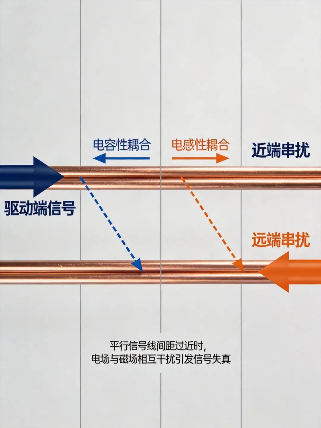 当两条PCB走线靠得很近时,它们之间存在寄生电容和寄生电感。一条信号线上的快速变化会通过这些寄生元件耦合到另一条线上,形成干扰。