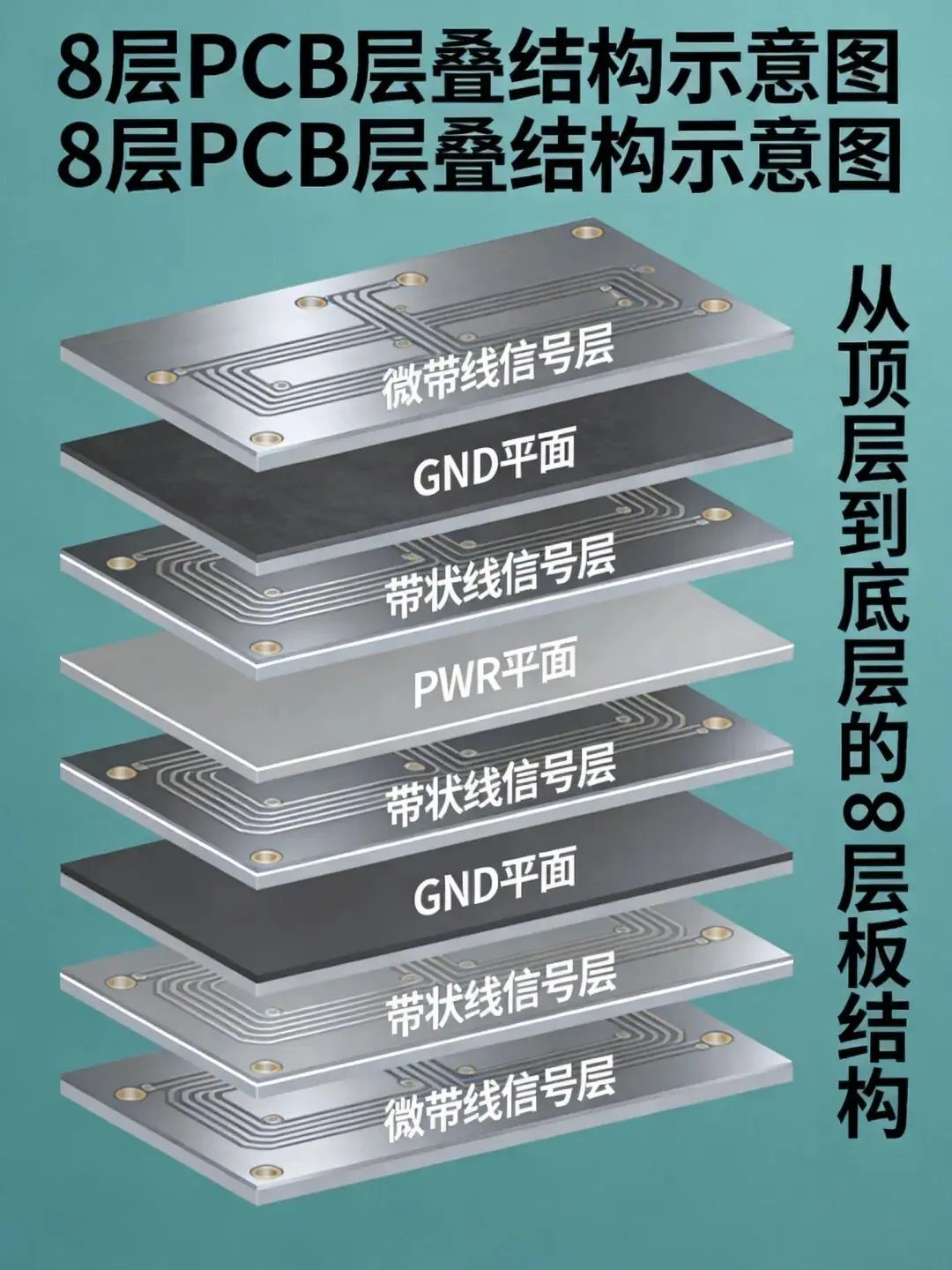 图注:上图是一个典型的8层PCB层叠结构。顶层和底层布置微带线,便于布线和调试;内层布置带状线,提供更好的信号完整性。GND和PWR平面相邻,形成良好的平板电容,为高速芯片提供稳定的电源。注意观察,信号层都与参考平面相邻,确保了阻抗的连续性和可控性。
