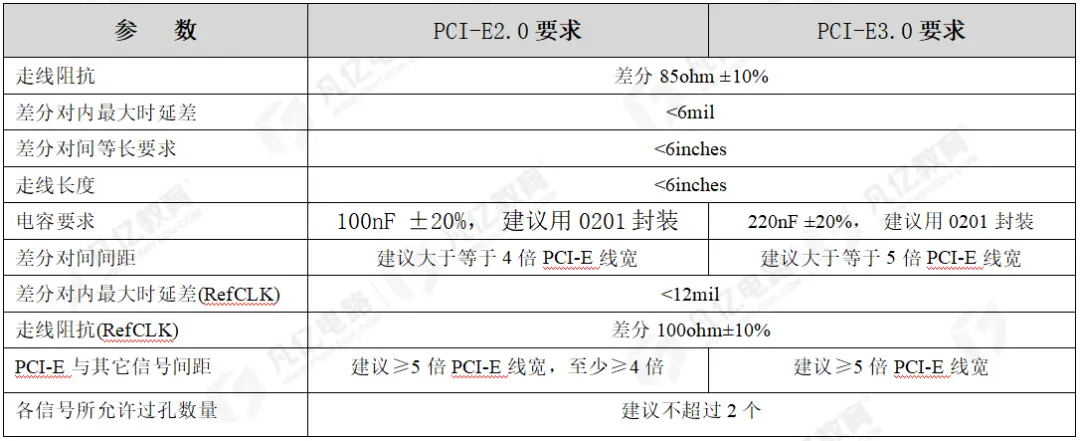 PCI-E接口的PCB设计有如下表1所示注意事项: