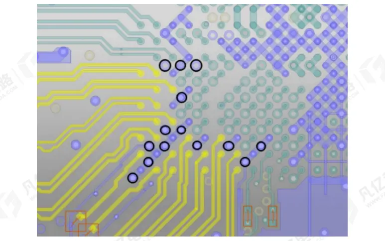 建议在 BGA 区域的以下位置加地通孔,并建议差分信号作包地处理,包地线的地孔间隔小于300mil。如图1所示。